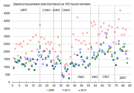 регионов не превышал 1470 преступлений на 100 тысяч человек, в том