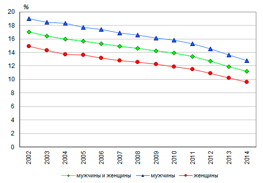 снизилась к 2014 году до 10,3% против 14,5% в 2004 году, то среди