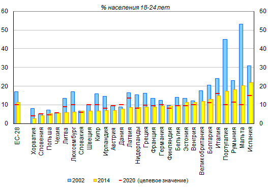 ЕС-28, 2002-2014 годы, % от численности населения 18-24 лет соответствующего