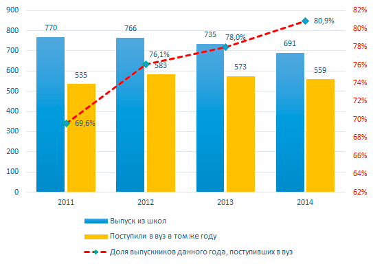 Рисунок 4. Выпуск из школ и прием в вузы в 2011-2014