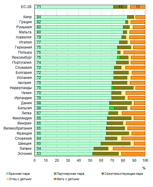 по ЕС-28 брачную пару в своем составе имеют 71% семей. Среди стран