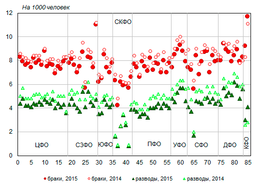 Уровень брачности и разводимости заметно различается