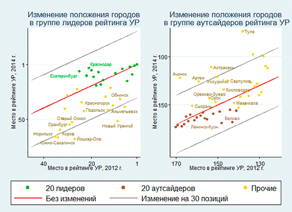 в группах городов-лидеров и аутсайдеров с 2012 по 2014 год