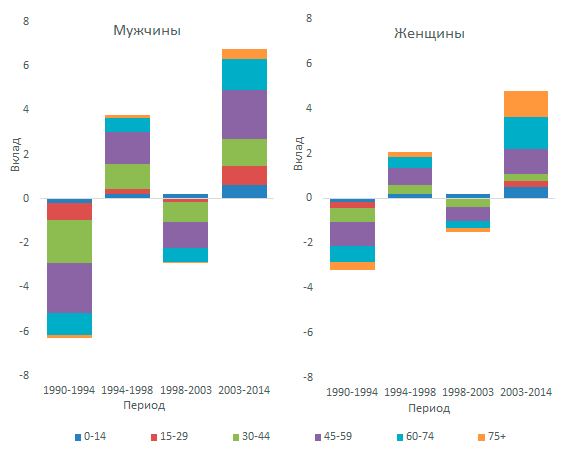 вклад возрастов старше 65 лет, но в 2014 году снижение смертности