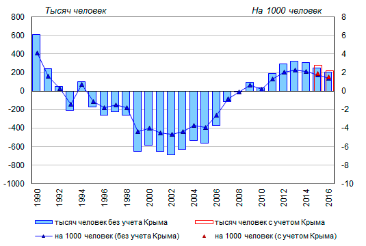 Прирост (убыль) населения России, 1990-2016 годы*, тысяч человек