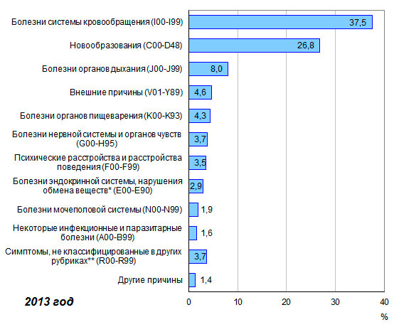 классов причин смерти, следуют болезни органов дыхания (8,0% в 2013