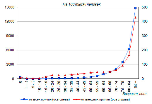 15-19 лет смертность от внешних причин утраивается, достигая 15