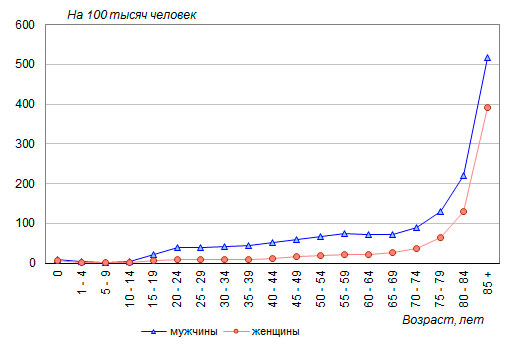 в старших возрастах он быстро возрастает – до 14832 на 100 тысяч