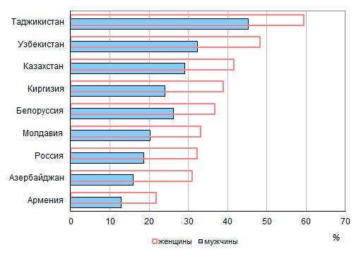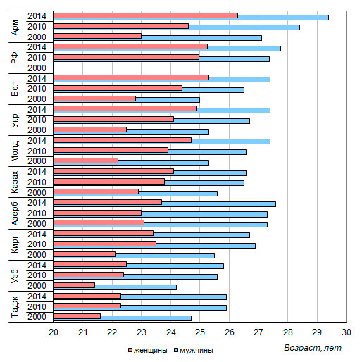на 2-4 года ниже. В 2014 году он составлял от 22,3 года в Таджикистане
