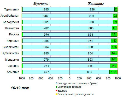 в браке. Их доля составляла от 970 на 1000 юношей 16-19 лет в России