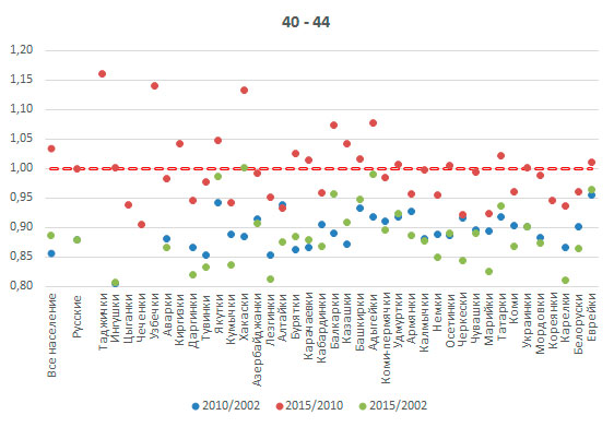 40-44 года за период между опросами 2002 и 2010 годов, между опросами