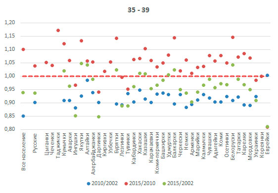 35-39 лет за период между опросами 2002 и 2010 годов, между опросами