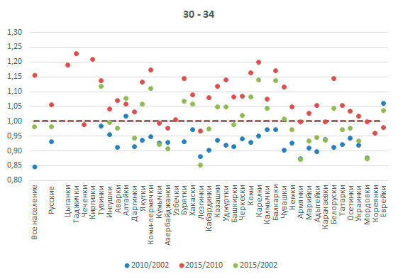 30-34 года за период между опросами 2002 и 2010 годов, между опросами