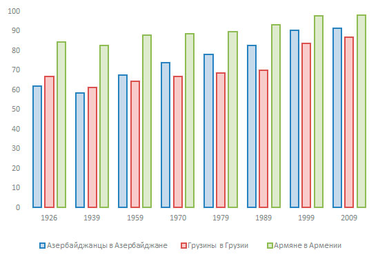 советских республиках Южного Кавказа по всеобщим переписям, %