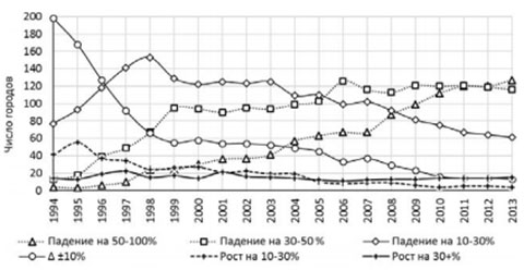 и т.д.). Максимальное падение - в небольших городах (от 25 до 100