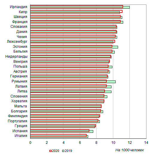 в Ирландии – 11,2‰, а самым низким – 6,8‰ - в Италии (рис. 12).