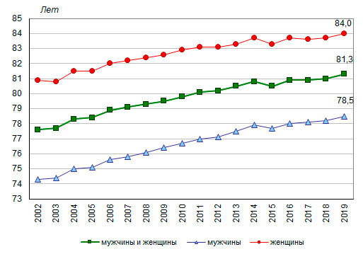в 2002 году до 78,5 года в 2019 году). У женщин она увеличилась