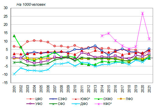 округов Российской Федерации, 2000-2021 годы, в расчете на 1000