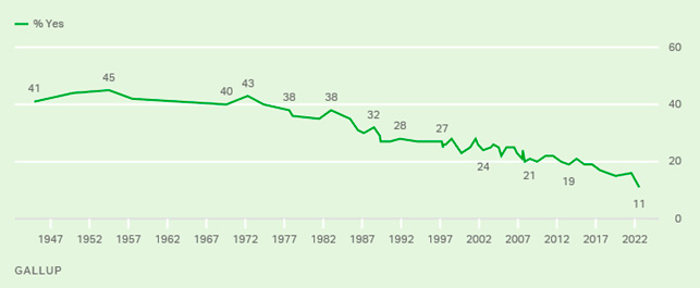 протяжении многих лет. С 1939 г. средний процент американцев, заявивших