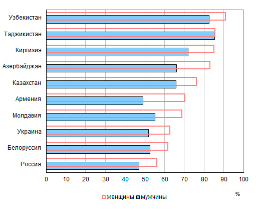 в брак в 2019 году, составляла от 56,0% в России до 90,9% в Узбекистане.