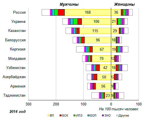 причин варьировалась от 23 на 100000 человек в Таджикистане до 168