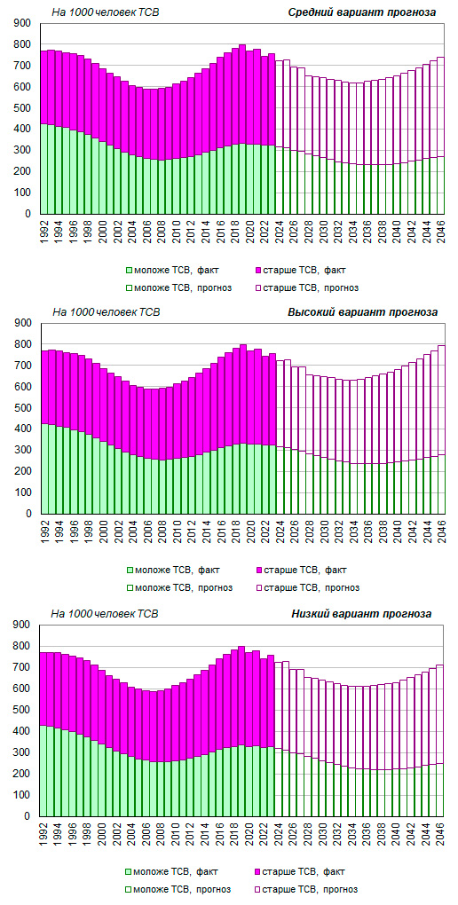 младше трудоспособного возраста по всем трем вариантам прогноза
