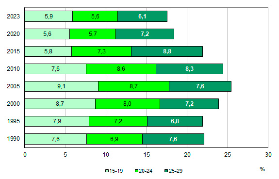 9,1% в 2005 году. Доля возрастной группы 25-29 лет, напротив, увеличивалась