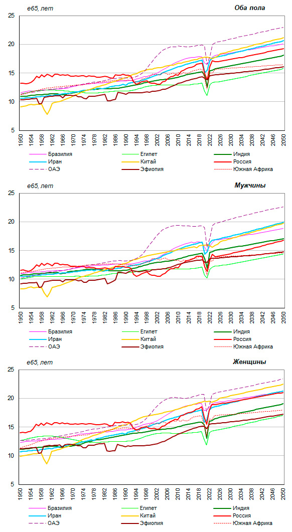 65 лет в группе стран БРИКС составляла для обоих полов от 13,3 года