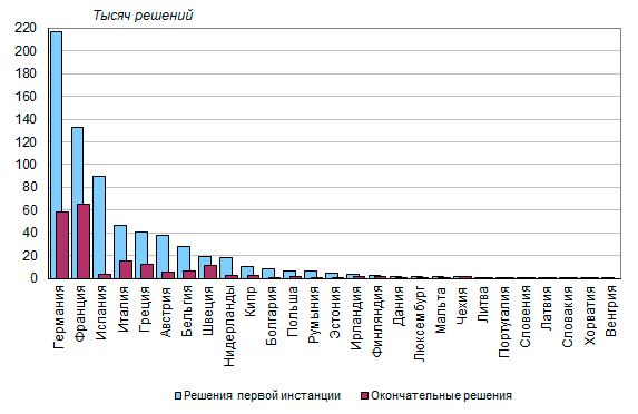 выделяются Испания (90 тысячи решений), Италия (46), Греция (40),