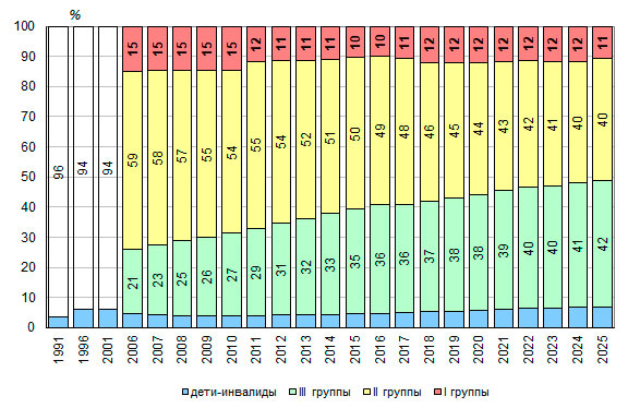групп - 40 и 42%, соответственно, инвалиды I группы составляют около