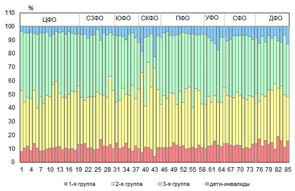 Доля инвалидов I группы составляет от 4,3% в Чеченской