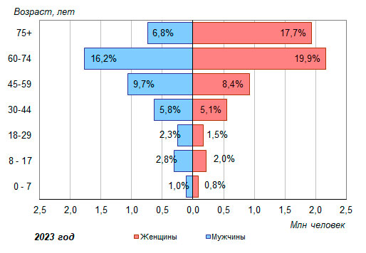 и возрасту по данным на начало 2023 года (рис. 8), хотя их общая