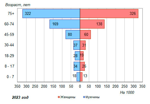 10,6%, с 23,3 до 25,8 на 1000 человек). В возрастной группе 60-74