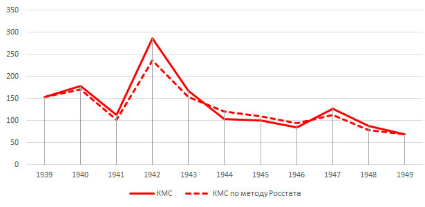 повышение в 1942 году, уже в 1944-м опустилась ниже довоенного уровня.