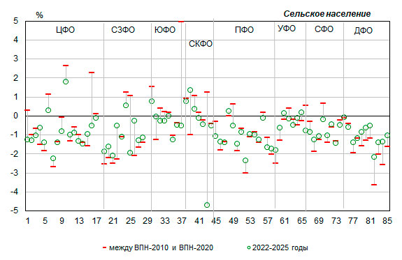 Среднегодовые темпы убыли сельского населения в 2022-2025