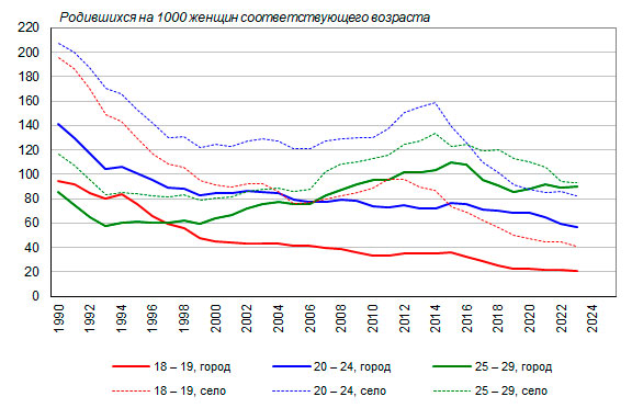 20-24 лет довольно устойчиво снижалась в 1990-2023 годы, а рождаемость