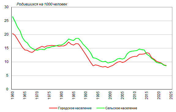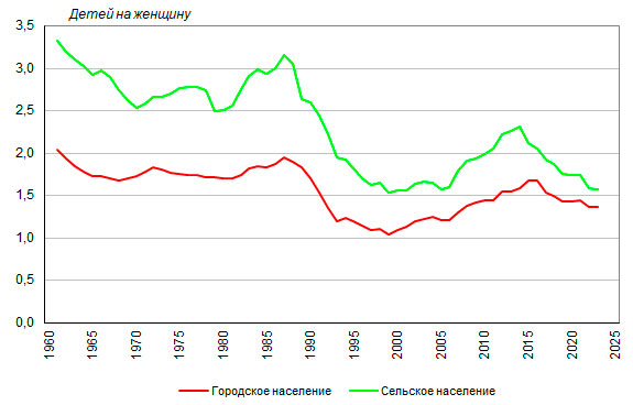 | В 2023 году суммарный коэффициент рождаемости городского населения составил 1,36, сельского – 1,57