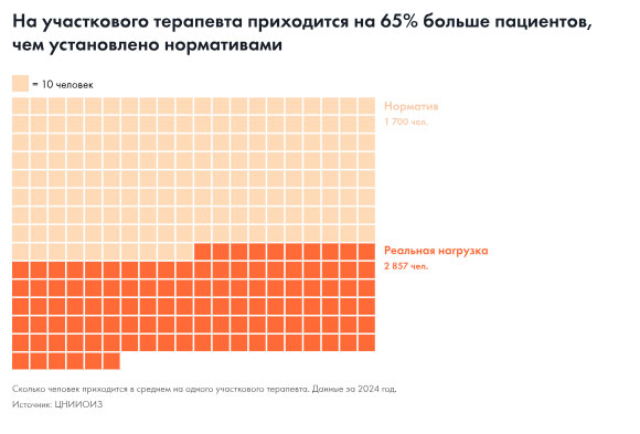 Участковый терапевт перегружен на 65%. На одного врача приходится