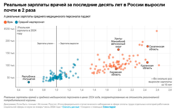 получают от 241 тысячи на Ямале до 65 тысяч в Ингушетии. За 25 лет врачей стало больше на 10% - но их доступность снизилась