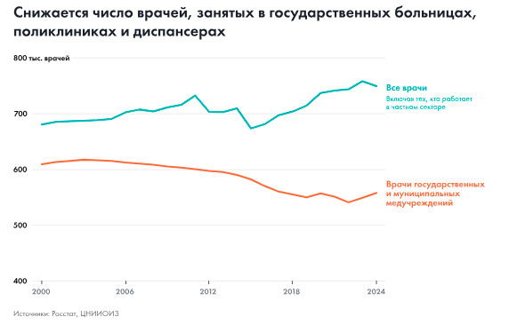 в частные клиники нет". В 2000 году в госучреждениях работали 89% врачей и такая же доля
