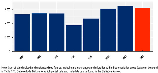 Постоянная миграция в ОЭСР, 2017-24 гг., тыс.