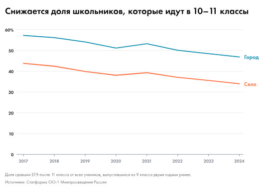 девятиклассников дошли до 11 класса в 2024 году, а в селе - только