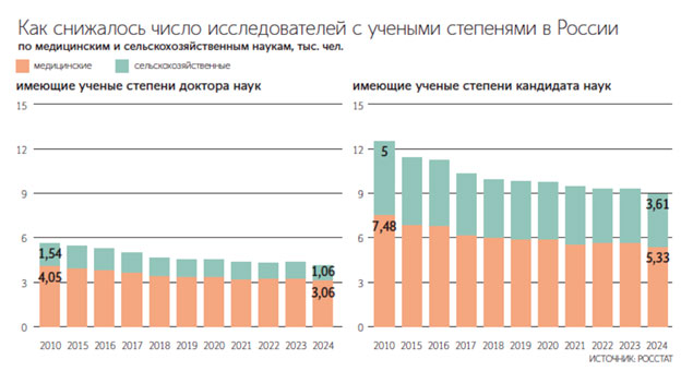 и техническим наукам (в 2010-2024 гг. число исследователей со степенями