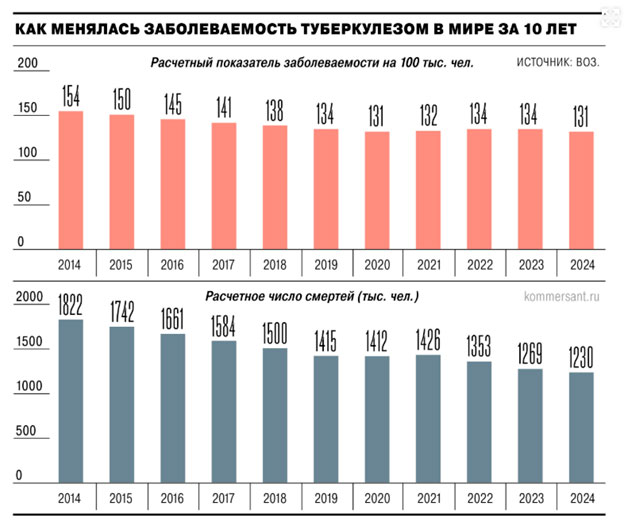 на 3% (в 2023 году из-за туберкулеза умерли 1,2 млн человек).