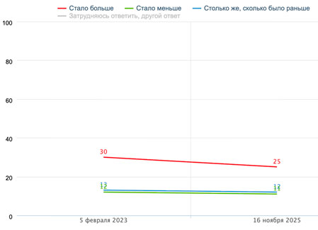 их стало меньше, а 14% полагают, что количество не изменилось.