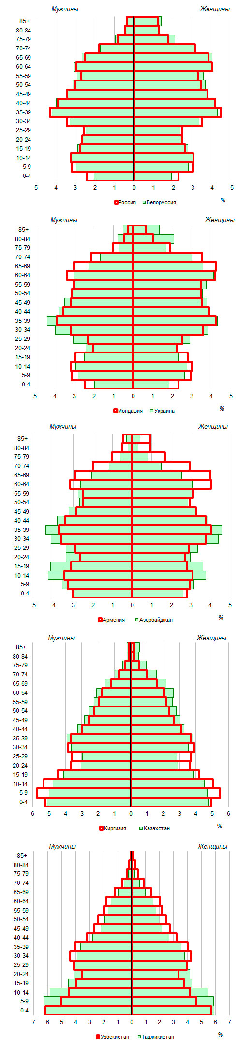 различаются. Половозрастные пирамиды населения Белоруссии, России,