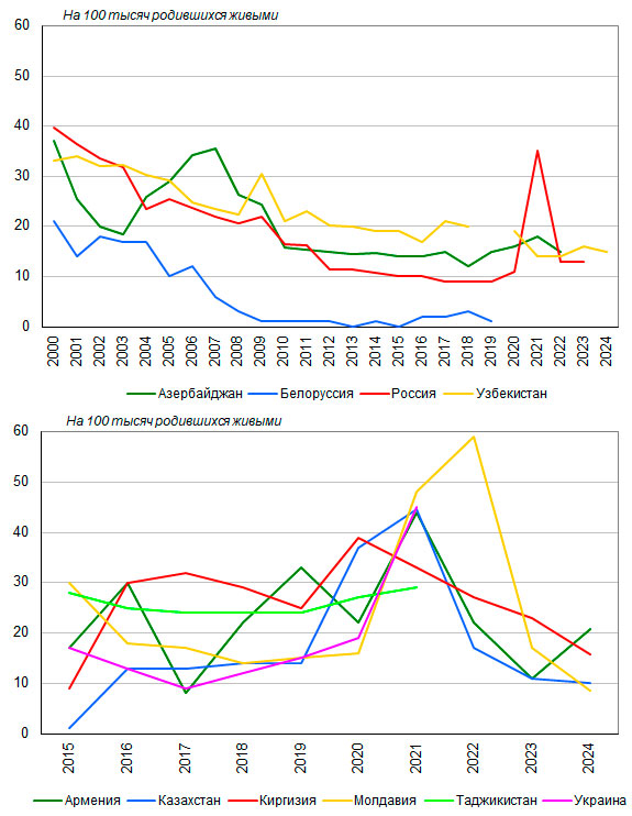 0 в Белоруссии до 30 на 100000 родившихся живыми в Молдавии, в 2018