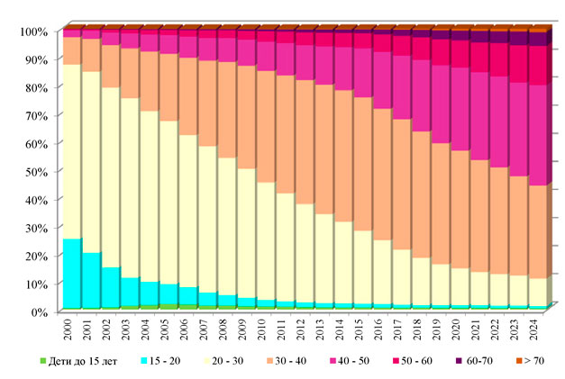возрасту на момент выявления ВИЧ-инфекции в 2000-2024 гг.
