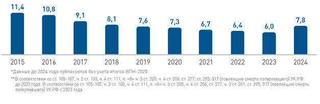 Жертвы умышленных убийств*, ** (на 100 тыс. населения,