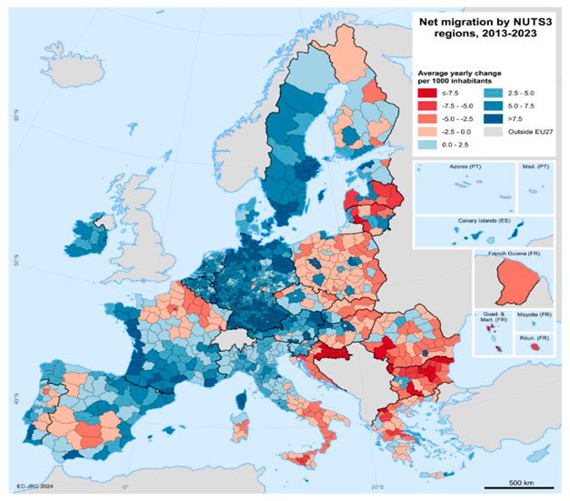 Миграционный прирост по регионам NUTS3, 2013-2023